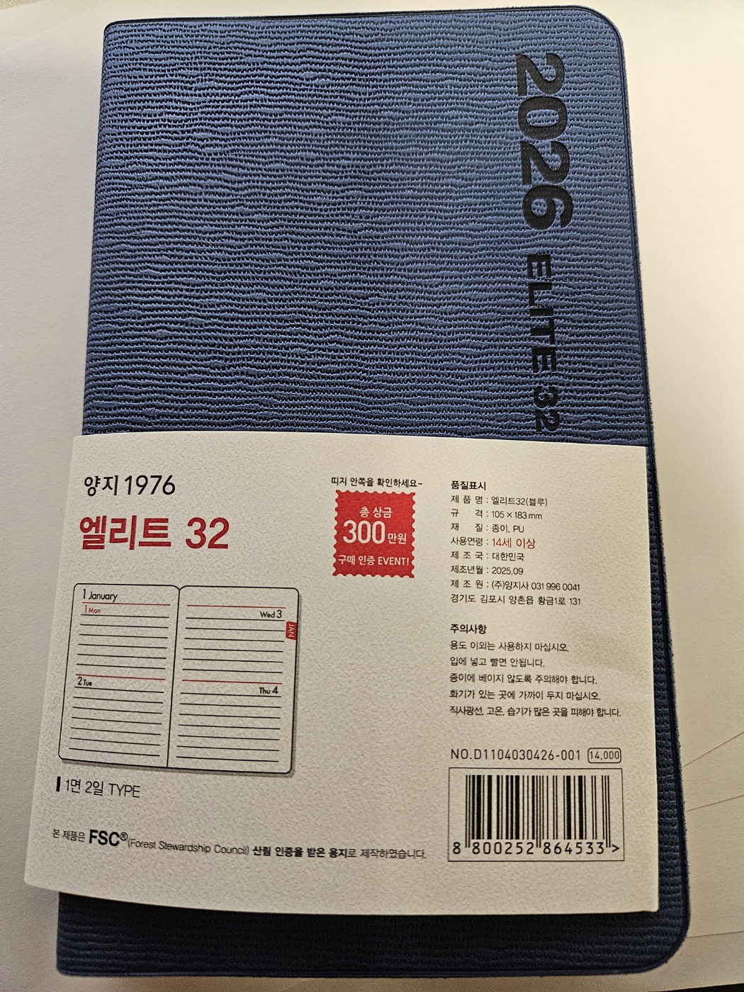작년에 구매하여 처음 사용하기 시작하였는데 너무 작지도 않고 크지도 않은 적절한 크기로 업무상 1년 동안 편하게 들고 다니면서 사용하였기에 올해도 연속 구매하였음. 만년필로 필기하여도 번지거나 비침이 거의 없어서 사용하기 유용함.