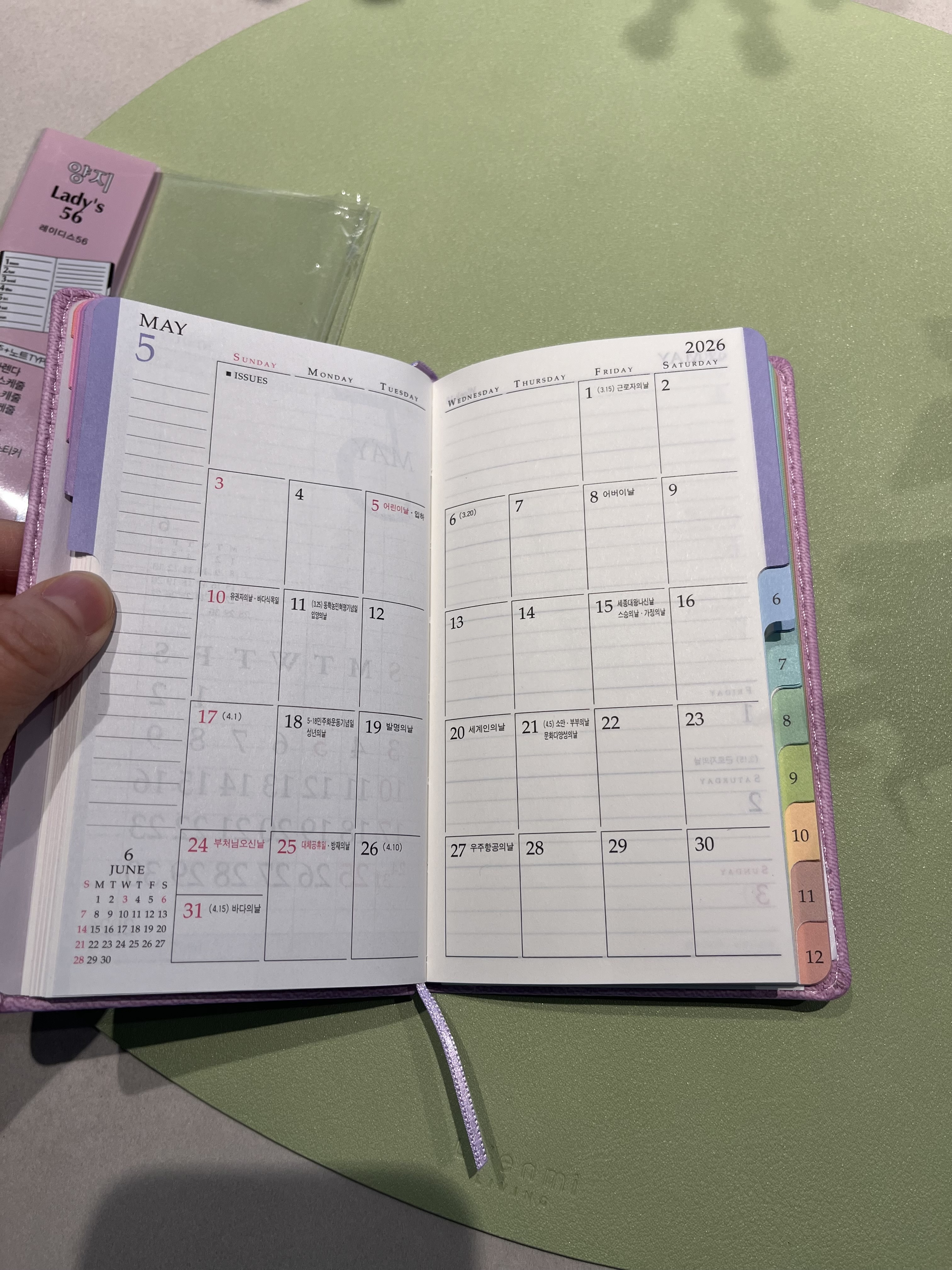 26년은 양지 레이디스 56과 함께 시작해보려고 구매했습니당 표지도 핑크톤에 너무 이쁘고 속지들도 달별로 컬러가 다르게 인덱스 되어있어서 찾아보기도 너무 좋아요 이 알록달록 예쁘게 표시된 인덱스들을 보셔요 ㅠㅠ 너무 이쁘고 기분마저 환해지는 느낌이에요 ㅎ 앞면에 전체달력이 있고 인덱스 넘기면서 달별로 볼 수 있는데 달별 첫인덱스에 그달의 달력을 또 표시해두고 뒷면을 펼치면 달별로 메모도 할수있게끔 더 큰 달력이 나오는부분이 너무 맘에 들어서 보자마자 구매했어요! 수많은 다이어리들이 있지만 양지 레이디스 56처럼 달력을 섬세하게 알차게 다 넣어둔 다이어리는 찾기가 힘듭니다 이름도 어쩜 섬세한 다이어리 속지에 어울리게 레이디스라니 안살 이유가 없어요 ㅎㅎ 전체달력에 형광펜으로 표시하고 해당달 속지앞면과 뒷면에 추가로 또한번 표시할수있어서 중요한날을 잊을수 없구요 ^^ 달별로 컬러를 다르게해둔 센스 덕분에 찾아보는것도 하나하나 넘기며 찾을 필요없이 바로 볼수있어서 직관적이고 너무 편하고 좋아요^^ 앞으로도 저는 레이디스 다이어리 계속 구매해서 살거에요 ! 무게도 가벼워서 어디든 휴대하기도 너무좋고 크기도 앙증맞고 이름은 물론 속지까지 너무 맘에들어서 레이디스와 함께할 26년이 기대됩니다 ㅎ 25년의 마지막날 레이디스를 구매했는데 너무 기분좋게 마무리하는것같아서 좋아요! ^^