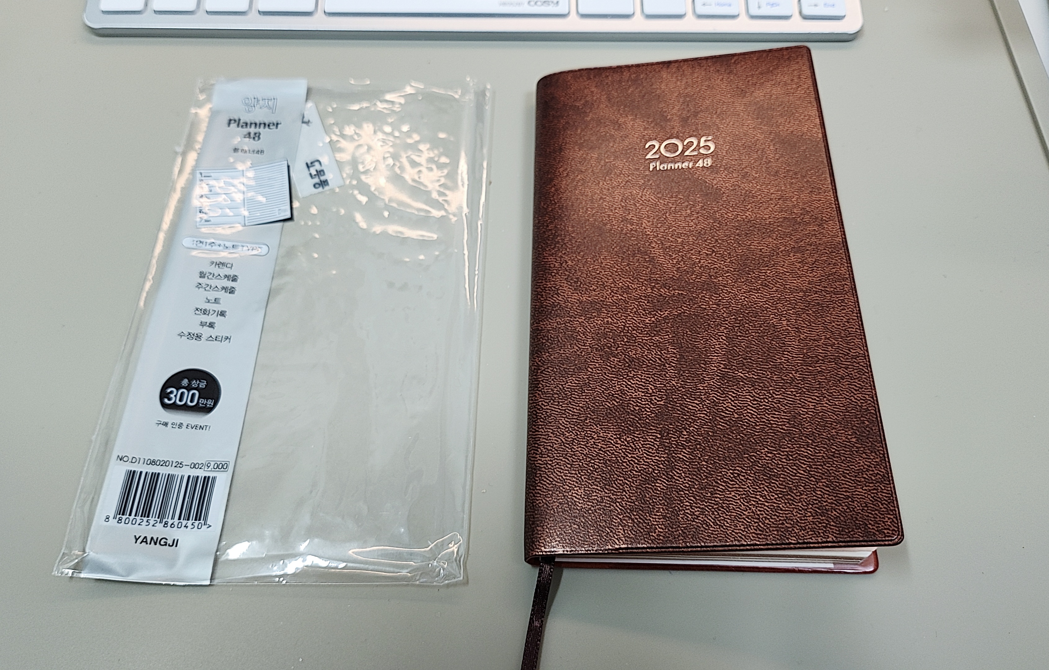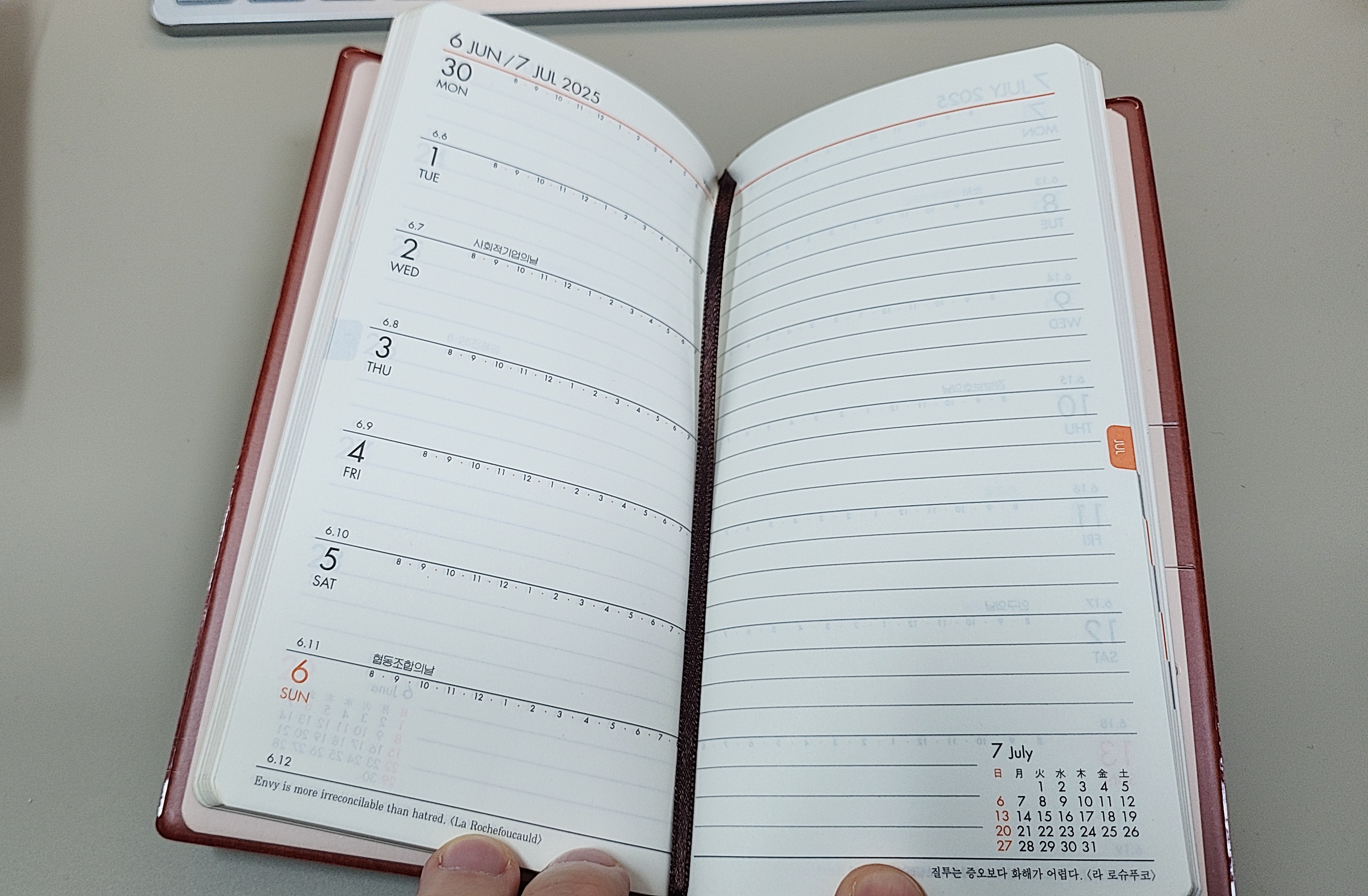 10년 가까운 세월동안 양지 플래너 48 세로형 다이어리를 써오고 있습니다. 2025년도에도 어김없이 오프라인 매장에서 구입!! 좀 더 촘촘하고 세세하게 일정을 정리하기 위해서 왼쪽면에 세로 2줄 오른쪽면에 세로 1줄을 더 그어서 활용 중입니다. 정장 자켓 왼쪽 주머니 쏙 들어가는 사이즈라서 너무 너무 편리하고 좋아요~!