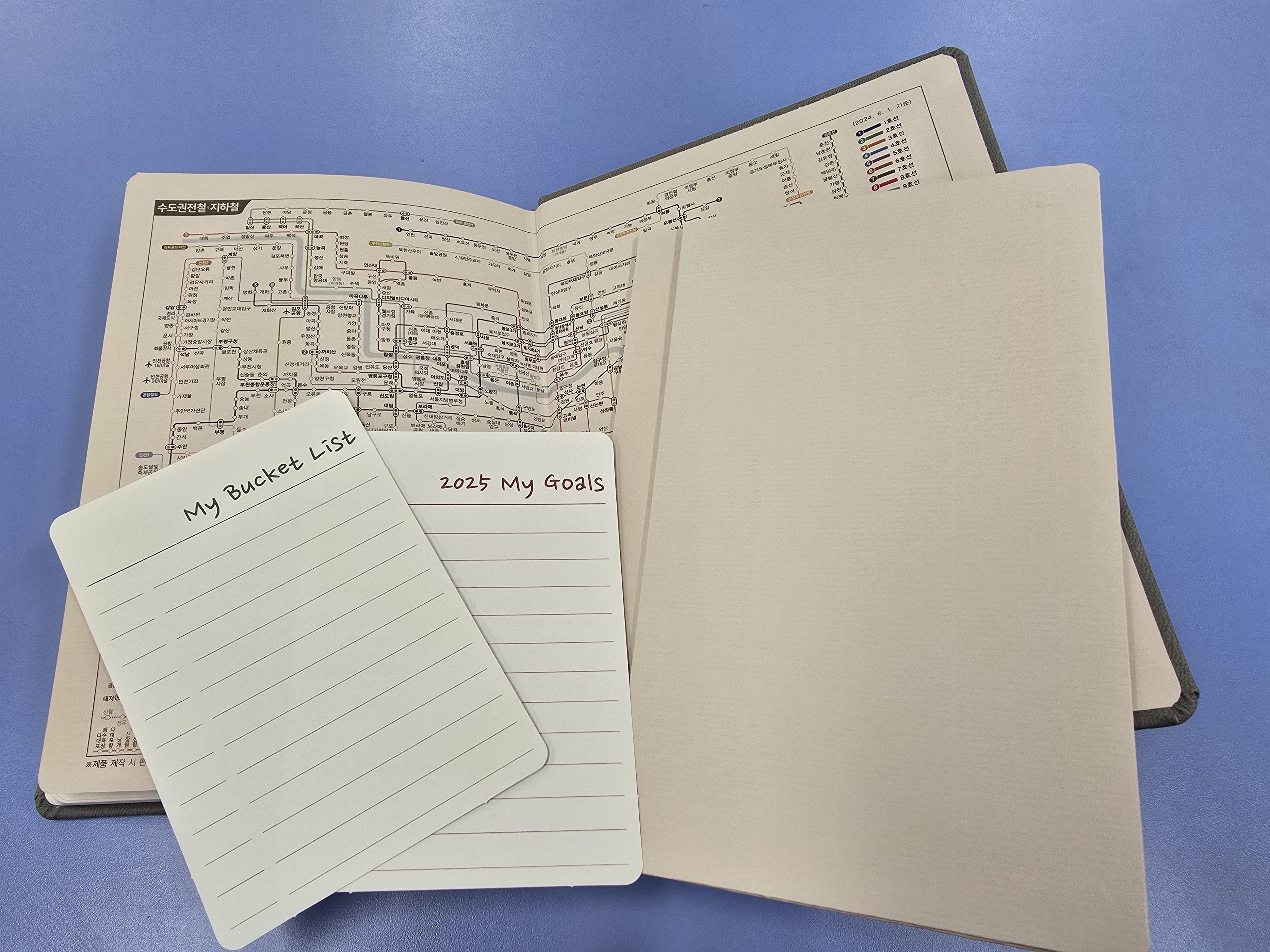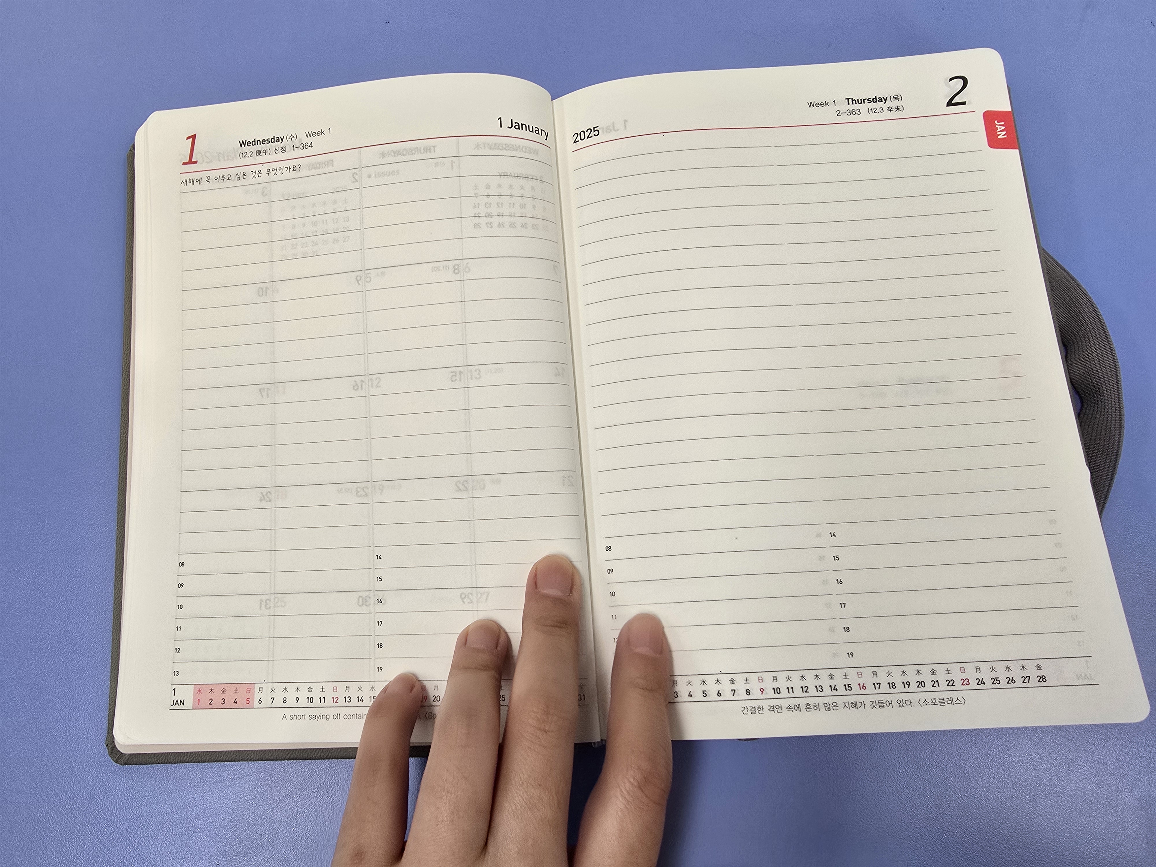 2025년 오프라인에서 다이어리 구매했는데 맘에듭니다. 일단 깔끔하고 얇아서 들고다니기 좋을거 같습니다. 업무용으로 쓸거라 토일은 작아서 더 좋아요. 꾸준히 쓰면서 업무하면 많이 도움이 될 것 같아요.