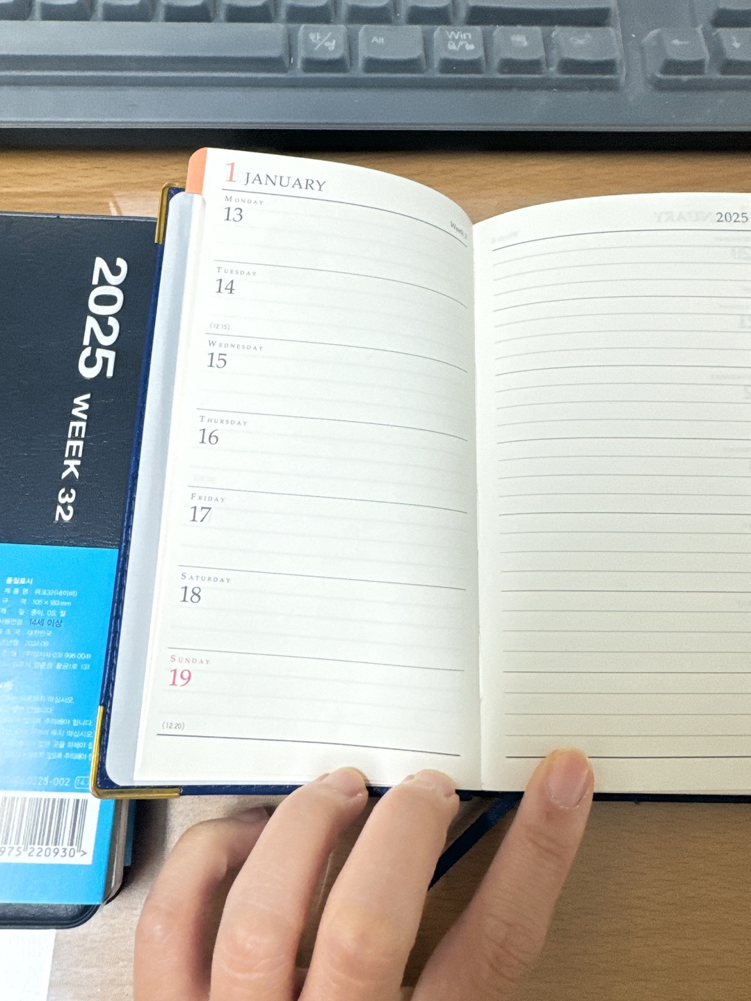 짝수년도 분홍색 홀수 년도 남색으로 사용하려 합니다. 내구성이 너무 좋아서, 정착합니다. 1.월+주+월+주로 사용할 수 있는 다이어리를 선호 2. 가벼워서 휴대성이 좋아야 할 것 3. 기념일, 음력이 기재되어 있어 계획이 용이함. 디자인은 변화가 없어서 제가 커스텀해서 사용하고 있습니다! 절대 단종안되요! 꼭 번창하시길